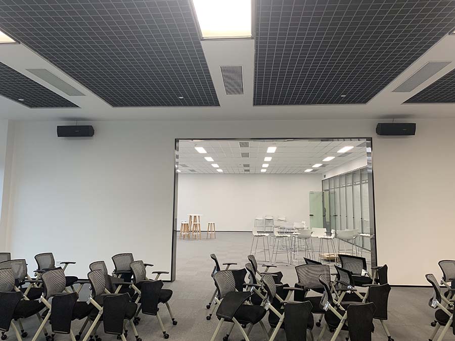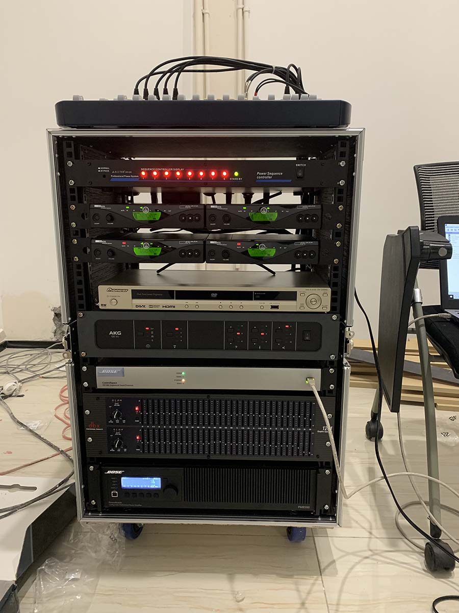 精信中心會議室音響擴聲系統由我公司負責設計、施工及維護。該會議室選用美國bose音響Bose F1 Model 812 可調指向性陣列揚聲器作為前置主擴聲音箱,Bose RoomMatch?RMU208 多用途揚聲器作為后場補聲音箱。功放選用Bose?PowerMatchPM8500可配置專業功率放大器,處理選用Bose?ControlSpace?ESP-880處理器,傳聲器選用AKG 手拉手話筒及AKG無線話筒,調音臺選用英國Soundcraft聲藝Signature 16調音臺。顯示屏選用P2.5室內全彩顯示屏。我公司為精信中心會議室擴聲系統提供音樂會品質的聲音和高水平的可擴展性和可配置性。以下是現場施工照片。