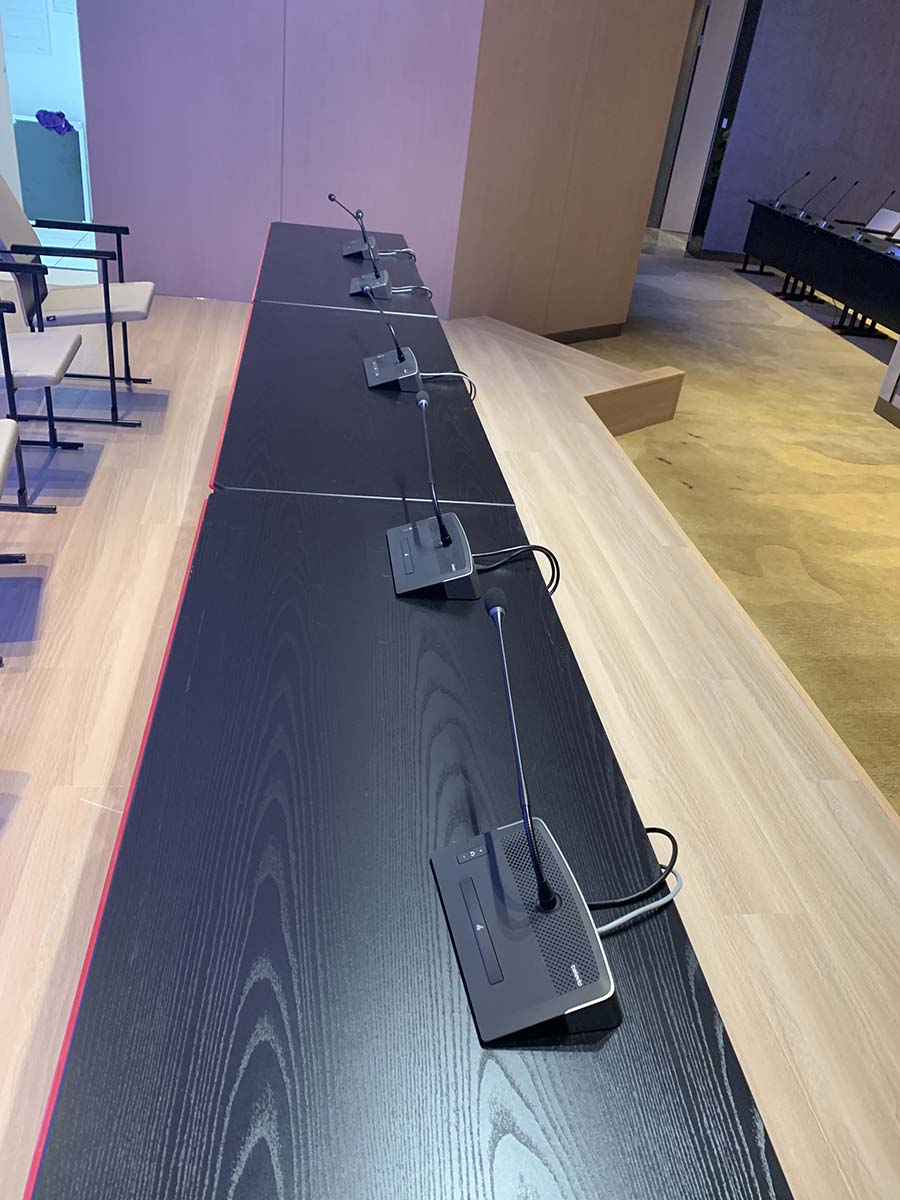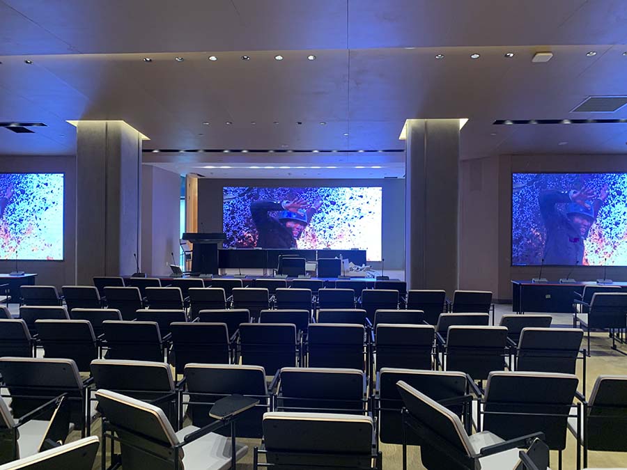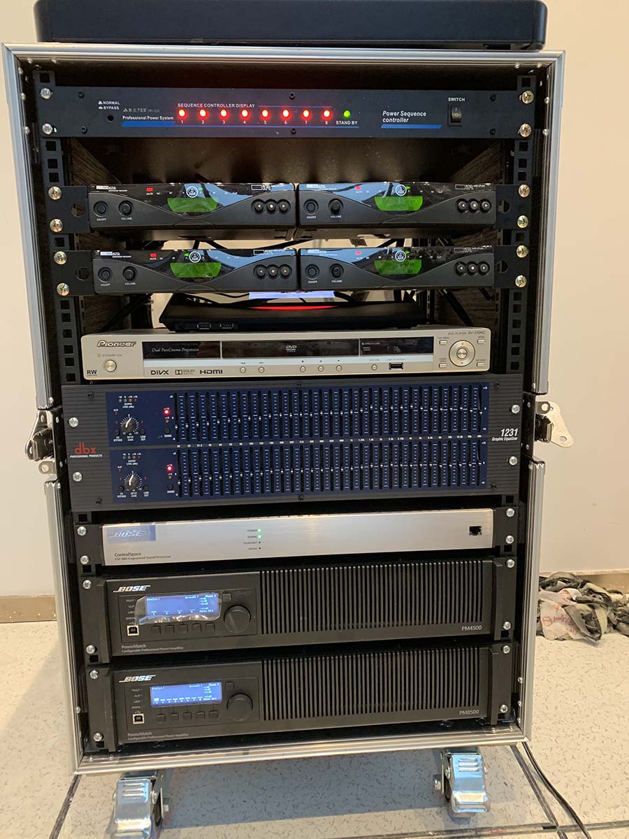 重慶中瑞產業園會議室音響擴聲系統及視頻顯示系統由我公司負責設計、施工及維護。該會議室選用美國bose音響Bose F1 Model 812 可調指向性陣列揚聲器作為前置主擴聲音箱,BoseRoomMatchRMU208 多用途揚聲器作為后場補聲音箱。功放選用BosePowerMatchPM8500可配置專業功率放大器,處理選用Bose?ControlSpace?ESP-880處理器,傳聲器選用西班牙televic手拉手會議系統及AKG無線話筒,調音臺選用英國Soundcraft聲藝Signature 16調音臺。顯示屏選用P2.5室內全彩顯示屏。我公司為精信中心會議室擴聲系統提供音樂會品質的聲音和高水平的可擴展性和可配置性。音箱全采用隱藏式安裝。以下是現場施工照片。