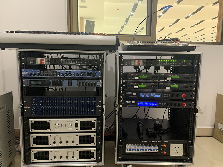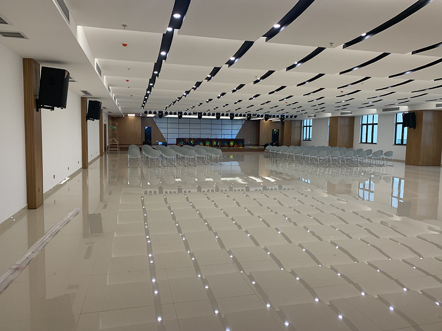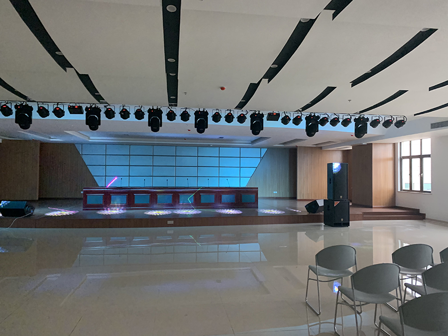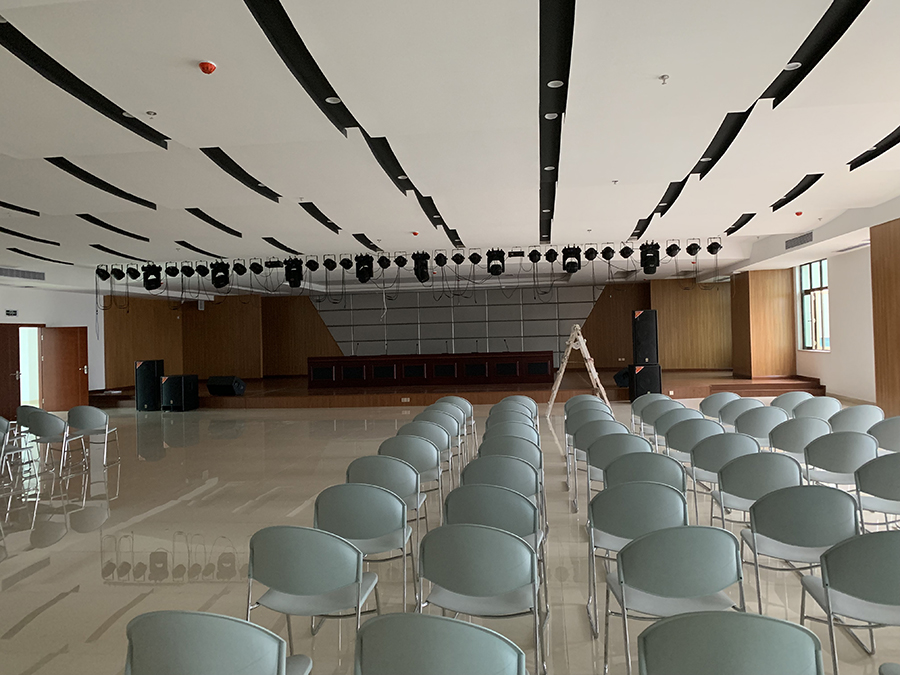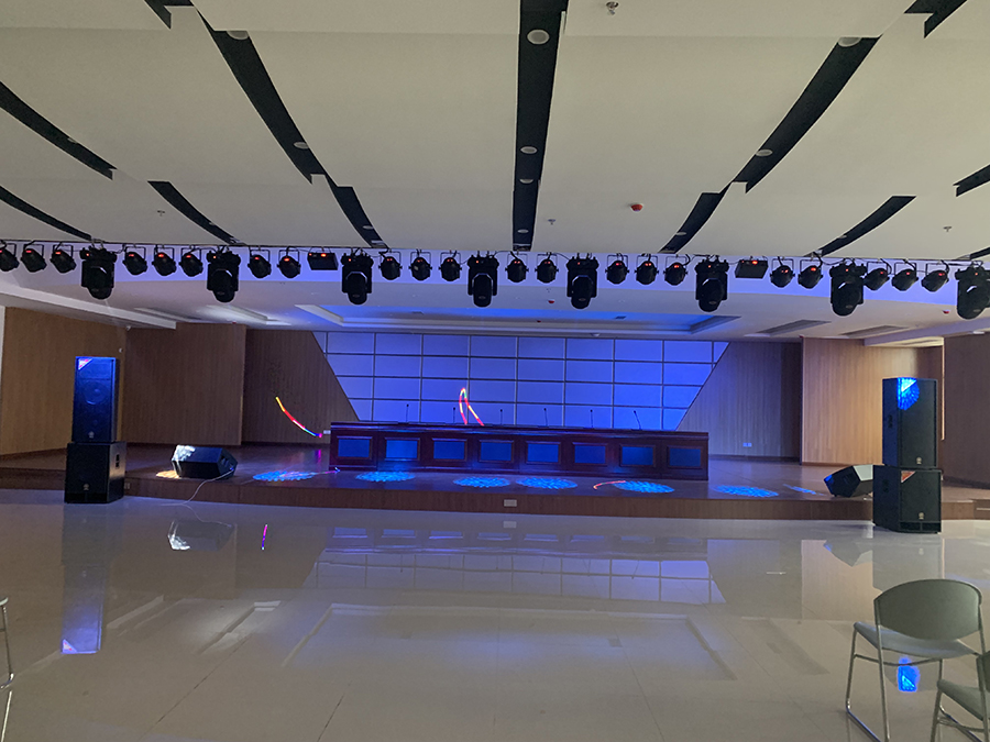 重慶兩江聯創電子有限公司多功能廳音響、燈光系統由我公司負責設計、施工及維護。該多功能廳選用YAMAHA音響、Soundcraft調音臺、televic D-Cerno數字會議系統、夜太陽燈光系統。以下是施工現場照片。