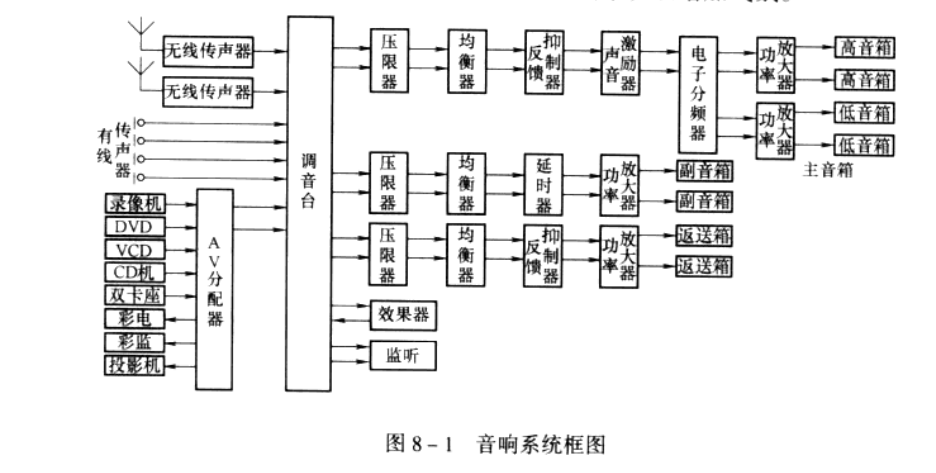 音響系統框圖舉例見圖8-1,這是一個歌舞廳音響系統,當然具體到某一個歌舞廳還得視歌舞廳幾何尺寸、形狀、要求水平高低、資金情況來具體設計,增減設備,例如需要時還可配上攝像機,把歌舞者的形象在屏幕上顯示出來,以增加氣氛。