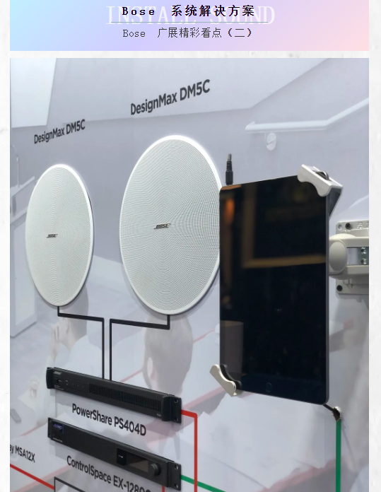 延續去年大受好評的系統墻, 由Bose專業揚聲器與實景圖片的虛實組合所構成的系統墻,為觀眾展現包括體育場館、報告餐廳、酒吧、教育場所,零售店等解決方案。豐富的系統圖展示,覆蓋各種實用場景。為專業觀眾解決平時工作中遇到的系統設計問題。Bose全力打造Sound Expansion理念即擴展型的系統解決方案。