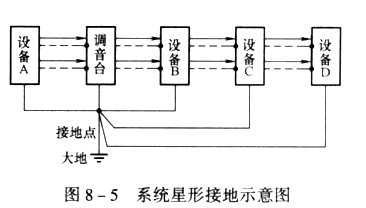 比較好的接地方式是所謂星形接地,如圖8-5所示,圖中每條屏蔽線的屏蔽層只有一端與設(shè)備的外殼相連,另一端懸空,通常以信號傳輸?shù)哪┒伺c外殼相連,每一臺設(shè)備在信號輸入端附近選一接地點(diǎn),通過銅芯導(dǎo)線集中到一點(diǎn),然后再用銅芯導(dǎo)線直接與大地相連,這根導(dǎo)線最好選截面積較大的線,以減小接地電阻。上述每一條屏蔽線只有一端接外殼的方式要求在不平衡方式連接時選用雙芯屏蔽線,其中一根芯芯線做信號熱端,另一根芯線做信號冷端,屏蔽不作為信號回路的一部分。