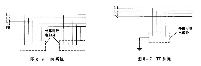 2)TT系統(tǒng)。電力系統(tǒng)由一點(diǎn)直接接地,用電設(shè)備的外露可導(dǎo)電部分通過保護(hù)線接至與電力系統(tǒng)接地點(diǎn)無直接關(guān)系的接地體,見圖8-7。