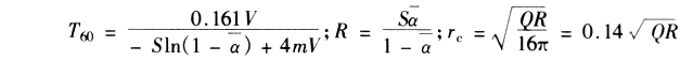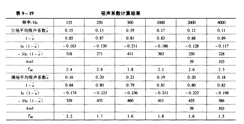 需要說明的是各種吸聲材料的吸聲系數并不是非常精準的,因為生產廠家的不同,材料性制可能有差異,另外混響室法和駐波管法的測試方法不同,也會造成測試參數的差異,還有安裝上也會有差異,所以最后計算出的參數供設計參考,還有用來計算混響時間的計算公式,本身并沒有保證計算的結果是非常精確的,另外公式本身是利用統計方法建立的,如果各種參數都是比較準確的,那么計算結果誤差也許在10%以內,實際上建筑設計的結果在最后完成裝修后各頻率的混響時間還要靠測試來驗證,必要時還要適當調整才能達到預定要求。所以計算過程中不必選取太多有效位數值,那種為了數據精確計算過程中保留小數點后很多位的做法,只增加計算的工作量,對工程設計毫無貢獻,至于各種裝修材料的吸聲系數值,請參考中國建筑工業出版社出版的(建筑聲學設計手冊)中國建筑科學研究院建筑物理研究所主編,和上海科學技術出版社出版的(噪聲控制技術)國家勞動總局主編,方丹群,王文奇,孫家其,陳潛等編等書的有關表格。計算出空場和滿場1000hz的混響半徑大約分別在8米和8.5米,頻率增高時,混響半徑稍微再減短一些,但是減短的數值并不大,見表9-19。