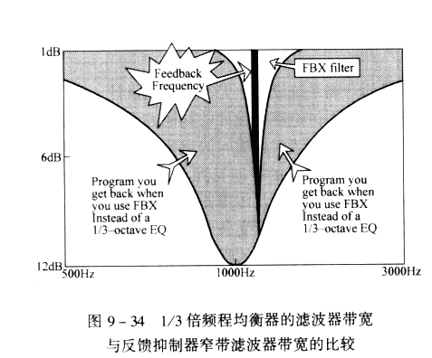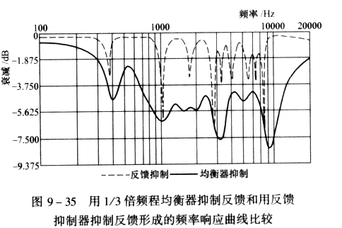 圖9-34是1/3倍平成均衡器的濾波器帶寬與反饋抑制器窄帶濾波器帶寬的比較,從圖上可以看出反饋抑制器的窄帶濾波器的帶寬遠遠比1/3倍頻程均衡器濾波器的帶寬小得多,當然反饋抑制器窄帶陷波濾波器對音質(zhì)的影響也遠遠比1/3倍頻程均衡器小得多,圖9-35舉例說明,用1/3倍頻程均衡器抑制反饋和用反饋抑制器抑制反饋形成的頻率響應曲線比較,其中粗實線代表1/3倍頻程均衡器,細實線代表反饋抑制器窄帶陷波濾波器,顯然用反饋抑制器后的頻響曲線對音質(zhì)的影響要好于用1/3倍頻程均衡器。