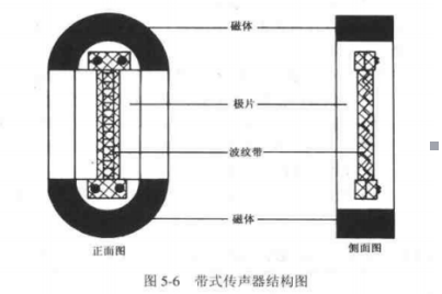 帶式傳聲器可以看作是動圈式傳聲器的變形,它的帶狀導體既是可它的振膜,又是它的音圈,其換能機理也是帶動導體切割磁力線產生感生電動勢。金屬帶的運動是由傳到它的前后壓力差決定的,但是傳聲器結構并不復雜,金屬帶是一根很輕的波紋型鋁合金金屬帶,一般也采用金屬化塑料帶或鈦箔帶制成,懸于強磁場的兩個磁極之間,一般情況下振帶厚度約為10-20um,長度通常為30mm,且多做成波折狀,聲波使金屬帶震動。做切割磁力線的運動,在振帶的兩端產生感生電動勢,進而產生電流,將聲音轉換成相應的電信號,圖5-6所示為帶式傳聲器結構圖。