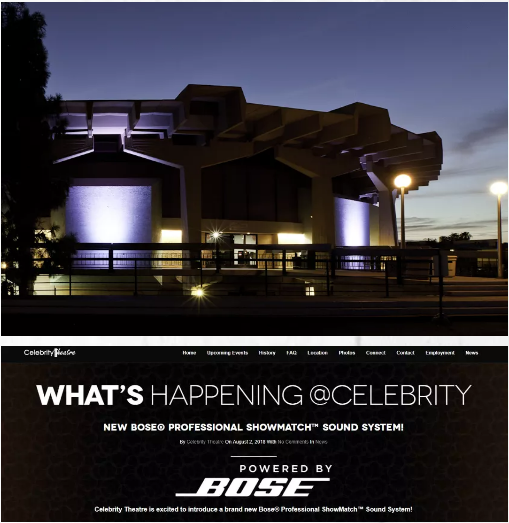 位于亞利桑那州鳳凰城的 Celebrity Theatre 對劇院內的陣列系統進行更新并從 Bose Professional 系列中選擇了 ShowMatch DeltaQ 系統進行安裝八月,Celebrity Theatre 以傳奇藝術家Tony Bennett的精彩演出正式揭開了其經過現代化改造后的神秘面紗。