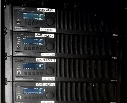 整套系統由 Bose ControlSpace ESP1280C 系列聲音處理器負責管理,其所需動力則由 32 個 Bose PowerMatch 8500N 功放共同提供。上述設備通過 Bose 專有的 AmpLink 卡進行連接,每張卡最多可支持八個未壓縮數字音頻通道,所有數字音頻設備均采用菊花鏈的方式進行連接。